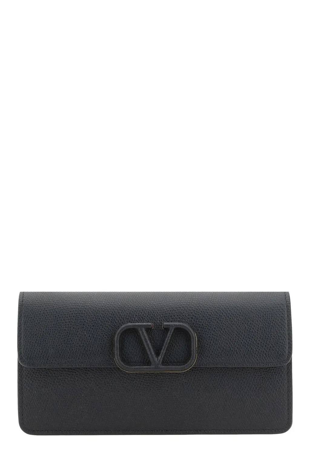 A black leather wallet with a fold-over top and a vltn logo clasp. It features a gold-tone chain strap.
