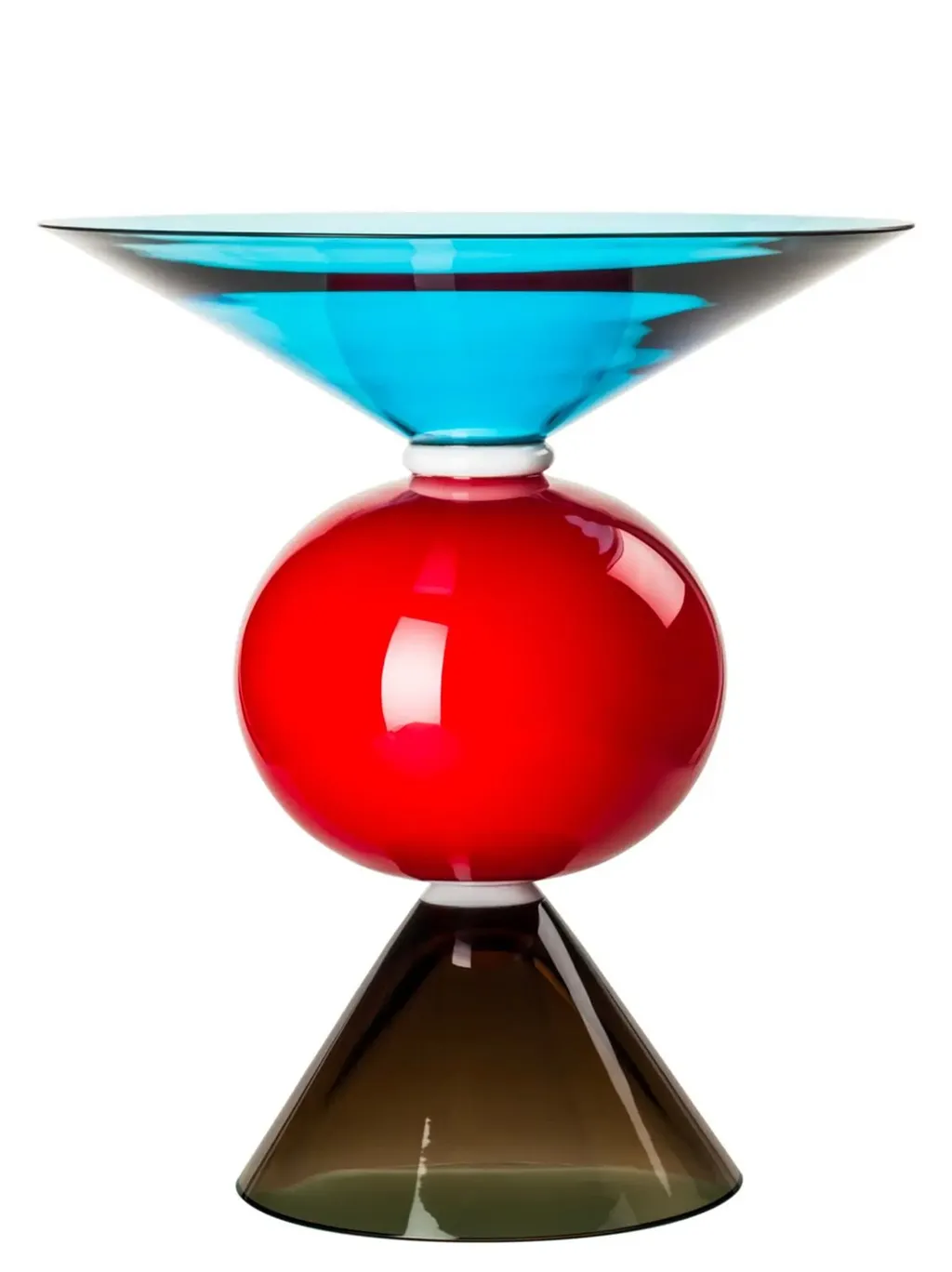 A decorative table with a conical blue glass top, a red spherical middle section, and a brown conical base. The sections are separated by white elements.