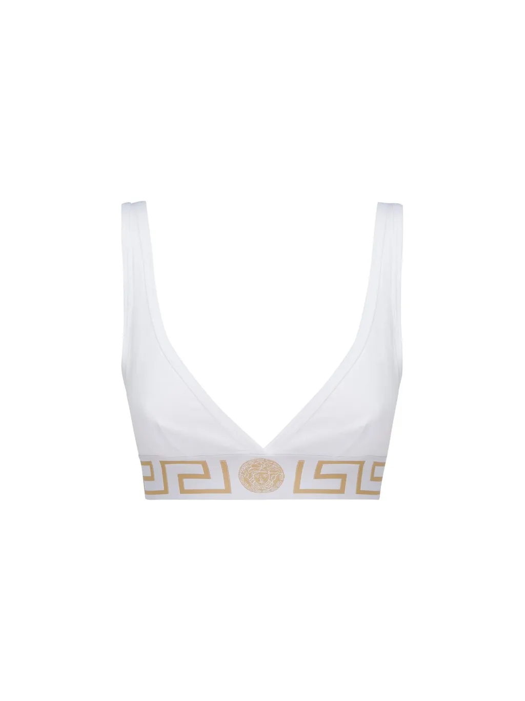 A white bikini top with a plunging neckline and a wide elasticated band featuring the iconic medusa head and greek key motif in gold.