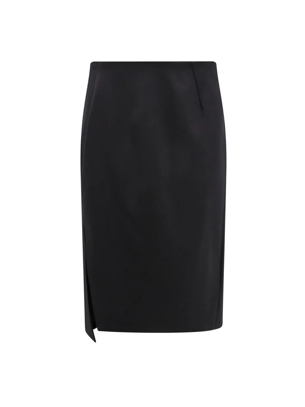 A black midi skirt with a straight silhouette and a subtle side slit. The skirt features a high waist and a clean finish.