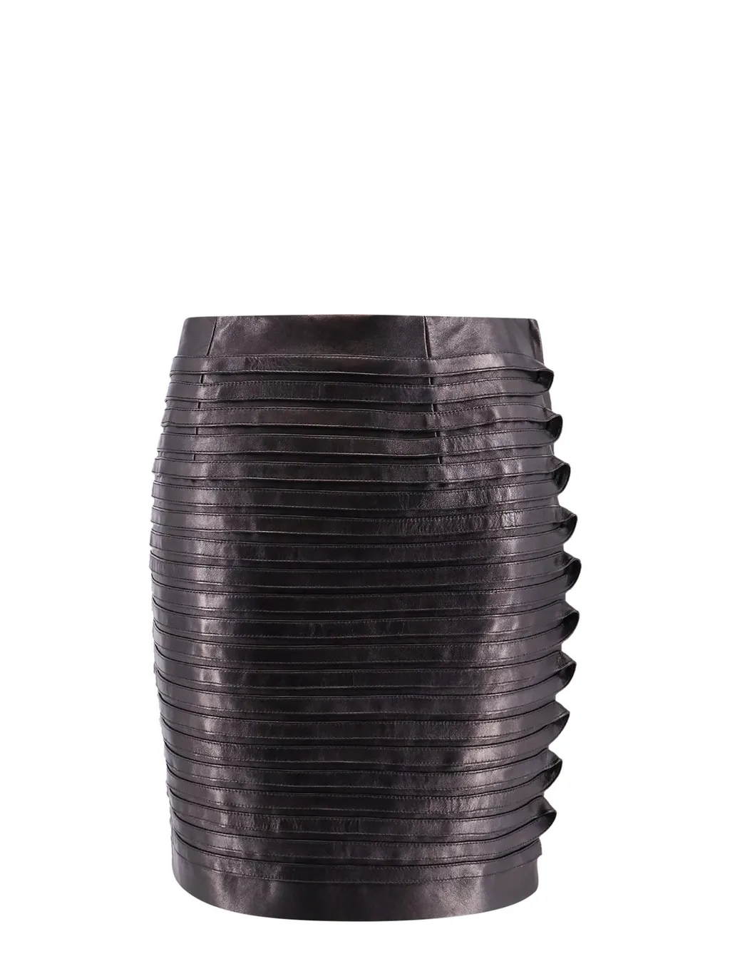 A black pencil skirt with a high waist and a layered, ruffled design. The skirt has a structured silhouette and falls to knee-length.