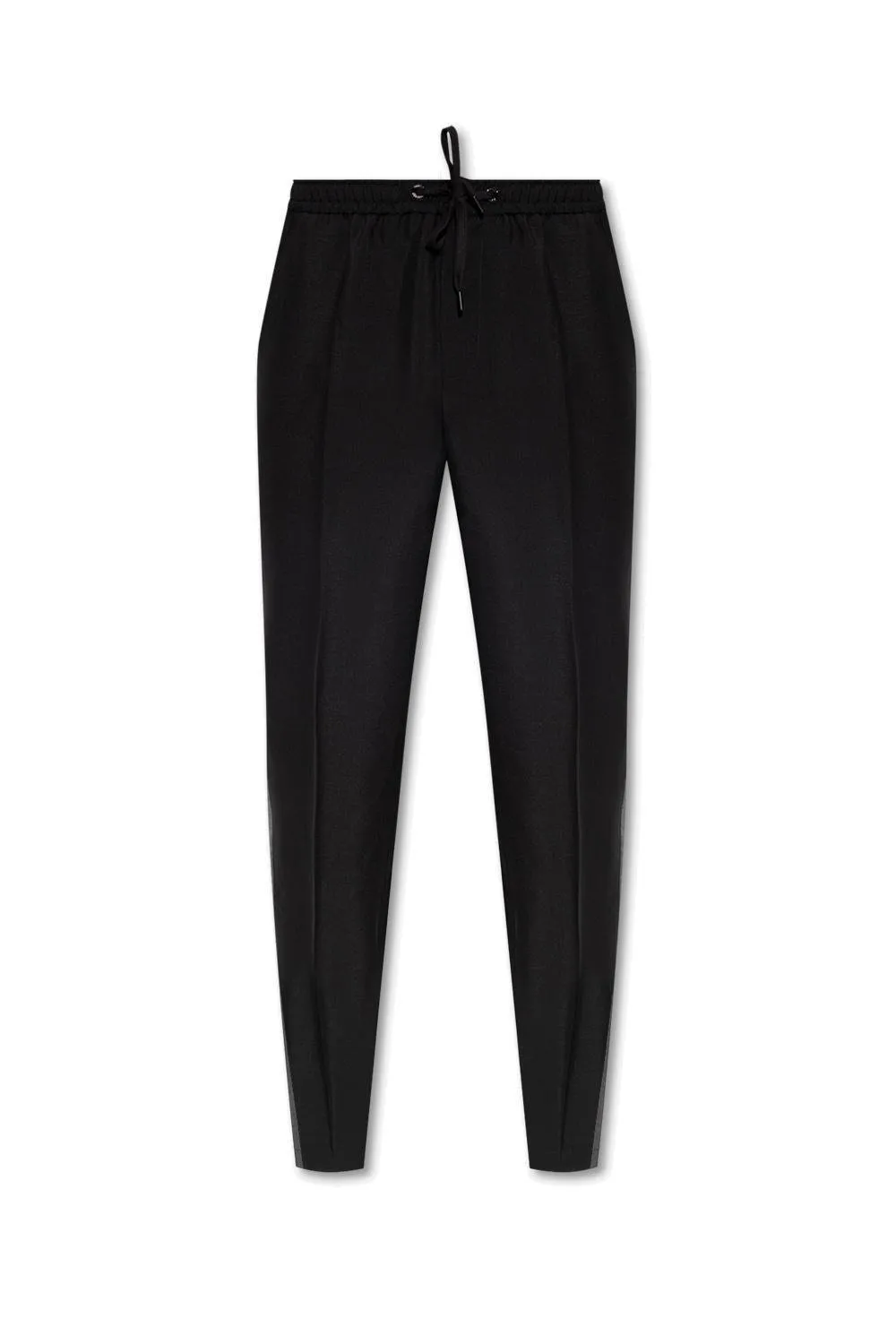 Black trousers with a drawstring elastic waistband. Features a straight leg silhouette and a creased front. The trousers have a relaxed fit and a casual yet refined aesthetic.