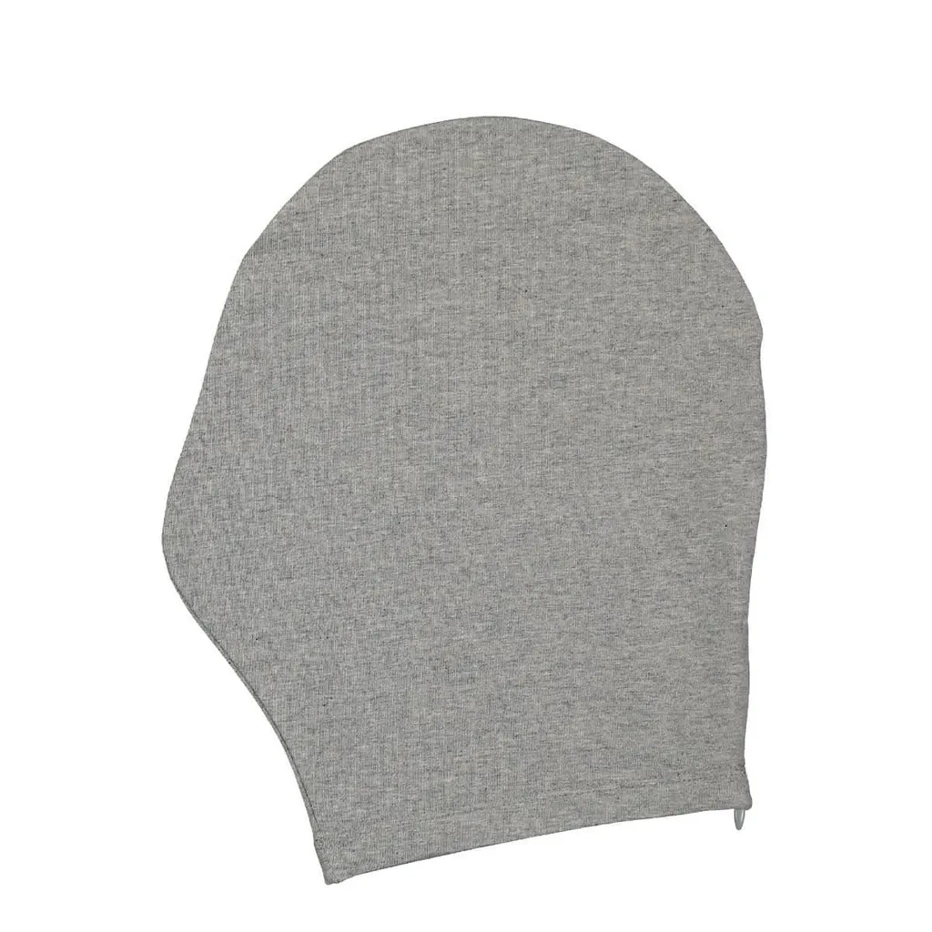 A grey balaclava made of a soft, ribbed fabric. It covers the head and neck, with a rounded top and an opening for the face. A zipper is visible on the side.