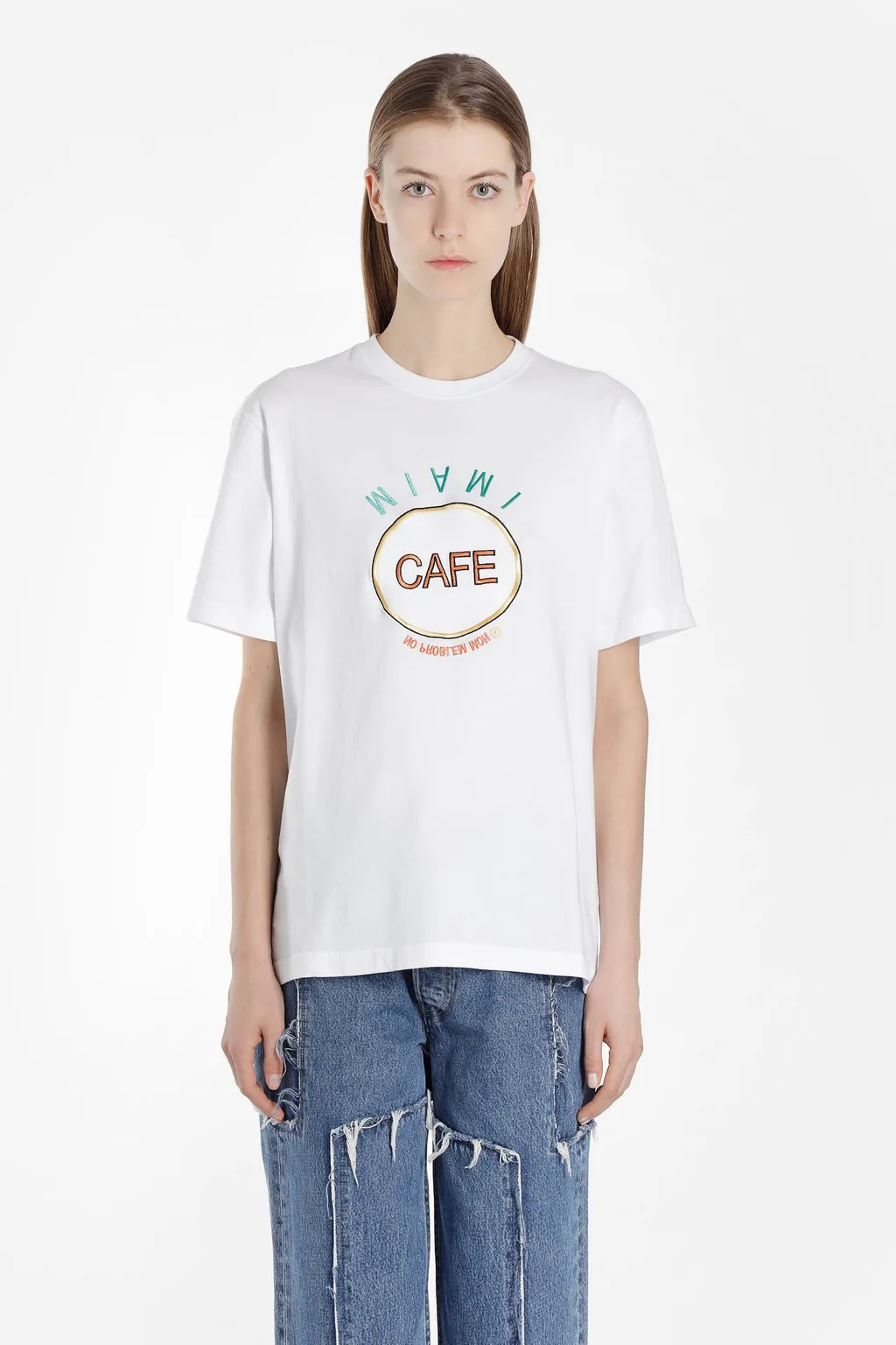 DescriptionA classic short-sleeve t-shirt in white, featuring a graphic print on the chest with 'cafe' in a circle, surrounded by 'miami' text and a sun-like motif. The back of the t-shirt displays a graphic of the earth with the text 'save the planet'.