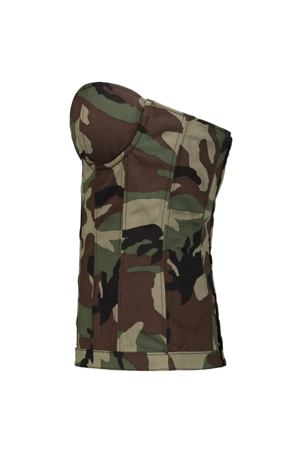 A strapless corset top with a sweetheart neckline and a front button-up closure. The top features a camouflage pattern and boning for structure.