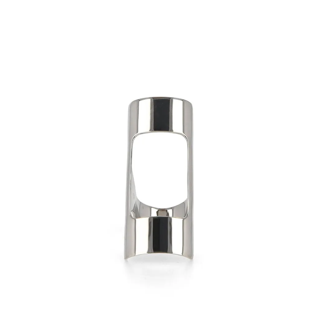 A metal finger pick with a black accent on top, designed to be worn on the finger for playing a musical instrument.
