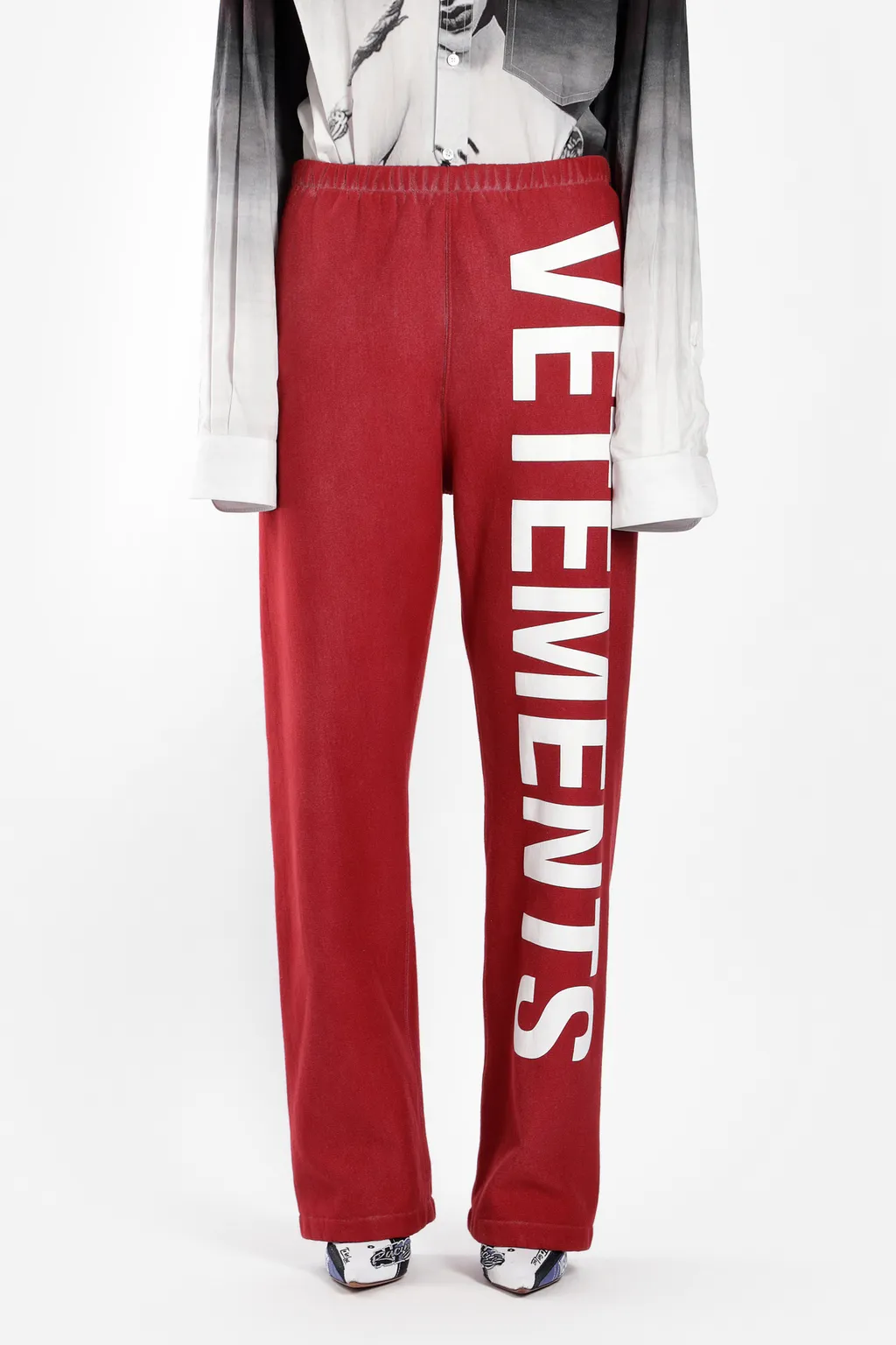 DescriptionLoose-fitting, wide-leg lounge pants in a vibrant red hue. Featuring a drawstring waist and prominent white 'vetements' logo branding vertically printed along the side of the left leg. The fabric appears to be a soft, slightly textured material, consistent with loungewear.