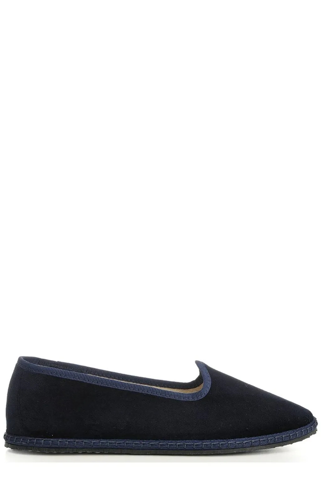 A pair of navy blue espadrille shoes with a dark blue trim. The shoes are slip-on with a rounded toe and a flat sole constructed from braided material.