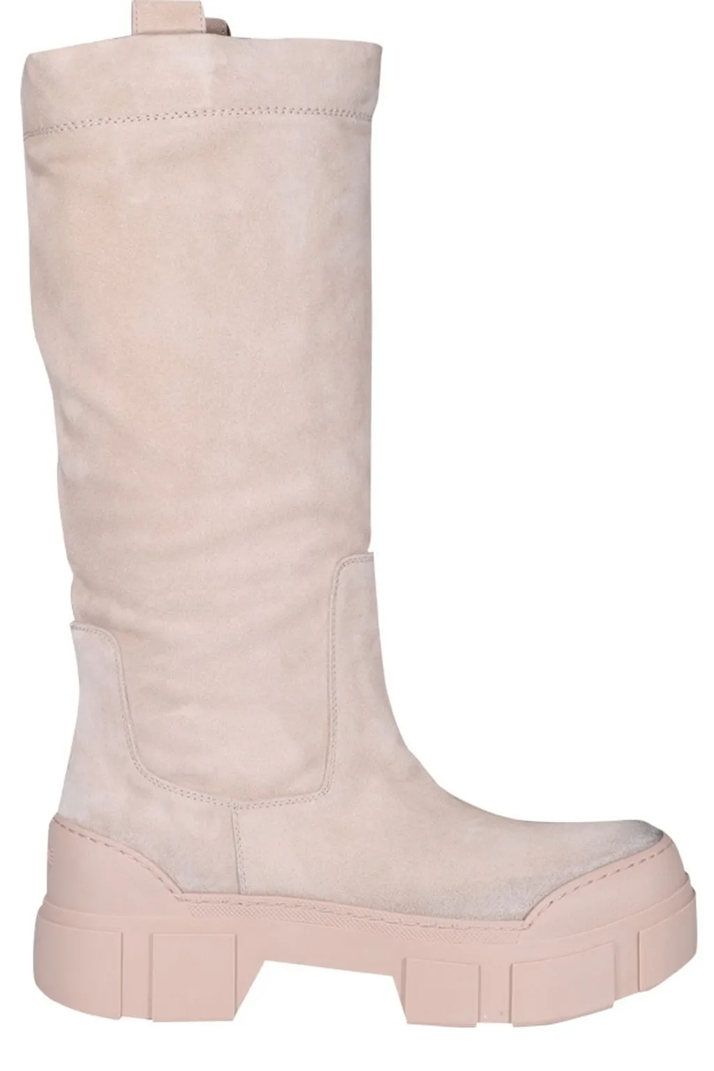 Beige suede knee-high boots with a chunky lug sole. The boots feature a pull-on style with a rounded toe and a slightly slouchy shaft. The sole is thick and textured, providing a modern, utilitarian aesthetic.