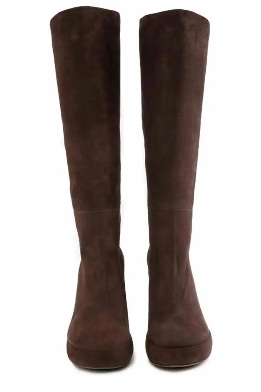 Knee-high boots with a platform sole and a block heel. The boots are made of suede and have a rounded toe.