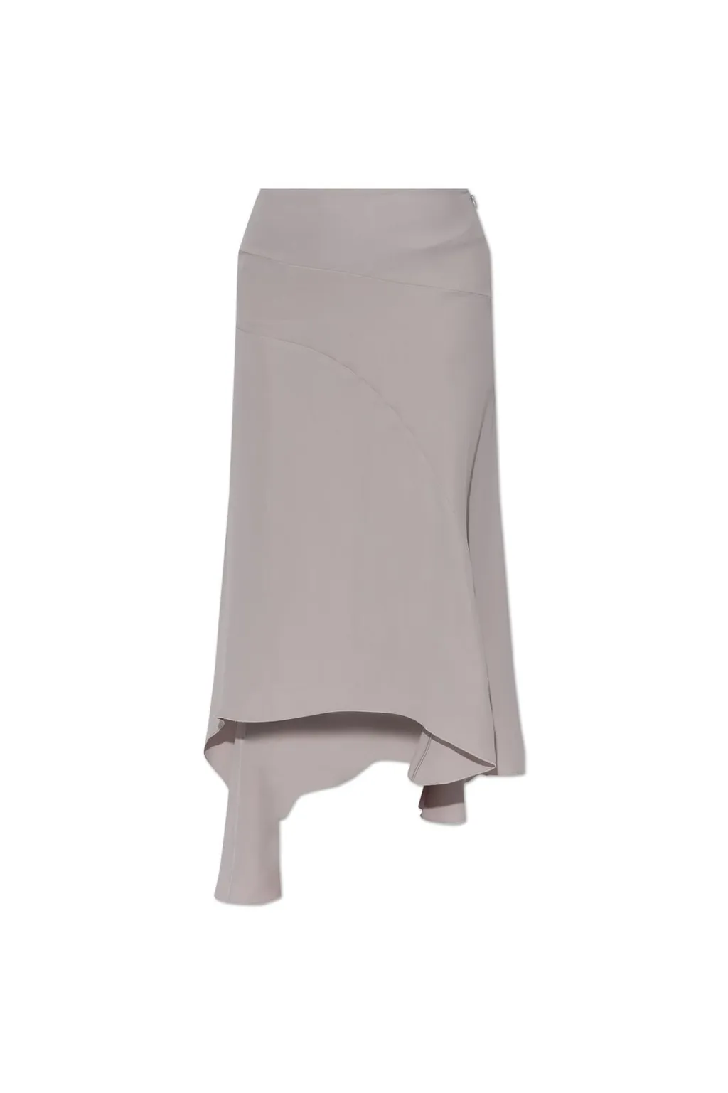A midi skirt with an asymmetric hemline, featuring a draped silhouette and a concealed side zip closure.
