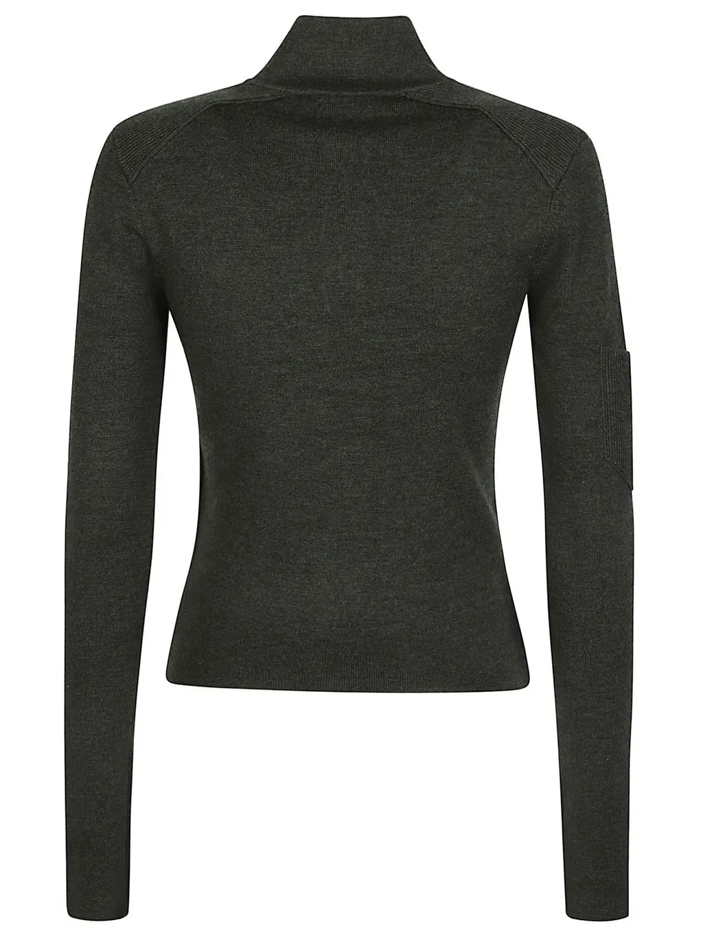 DescriptionA women's dark green knit zip-up cardigan with a mock neck and long sleeves. It features ribbed detailing on the shoulders and a small patch pocket on the left sleeve. The cardigan has a full-zip front closure with a silver-tone zipper pull.
