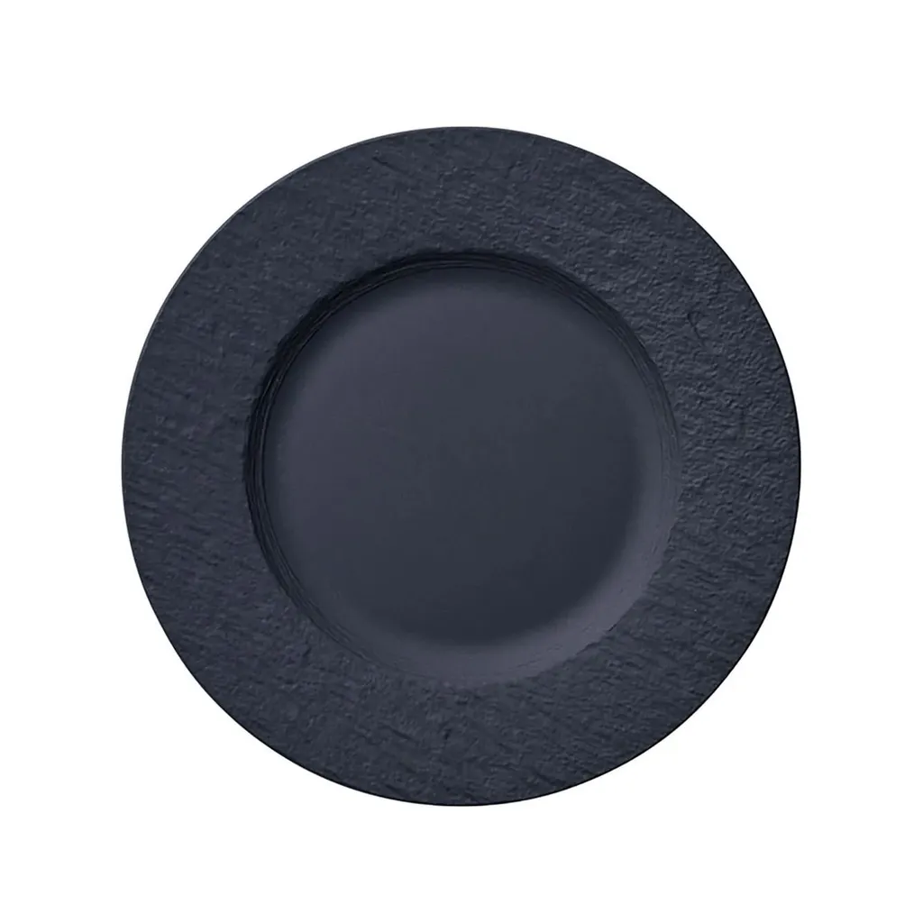 A round charger plate with a textured rim and a smooth, matte center. The plate is solid black.