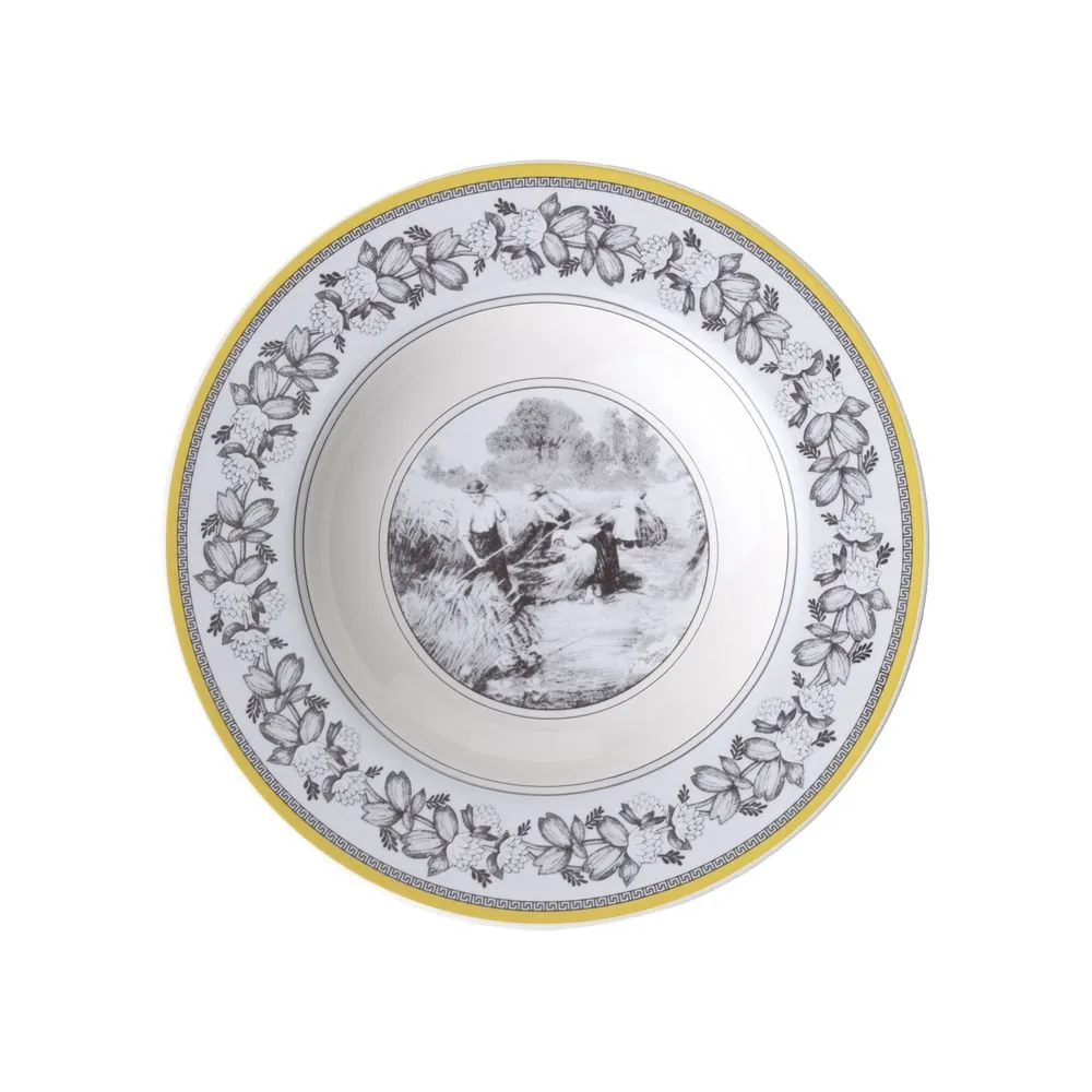 A white decorative plate with a yellow rim. The plate features a black and white pastoral scene in the center, surrounded by a floral border. The scene depicts figures working in a field.
