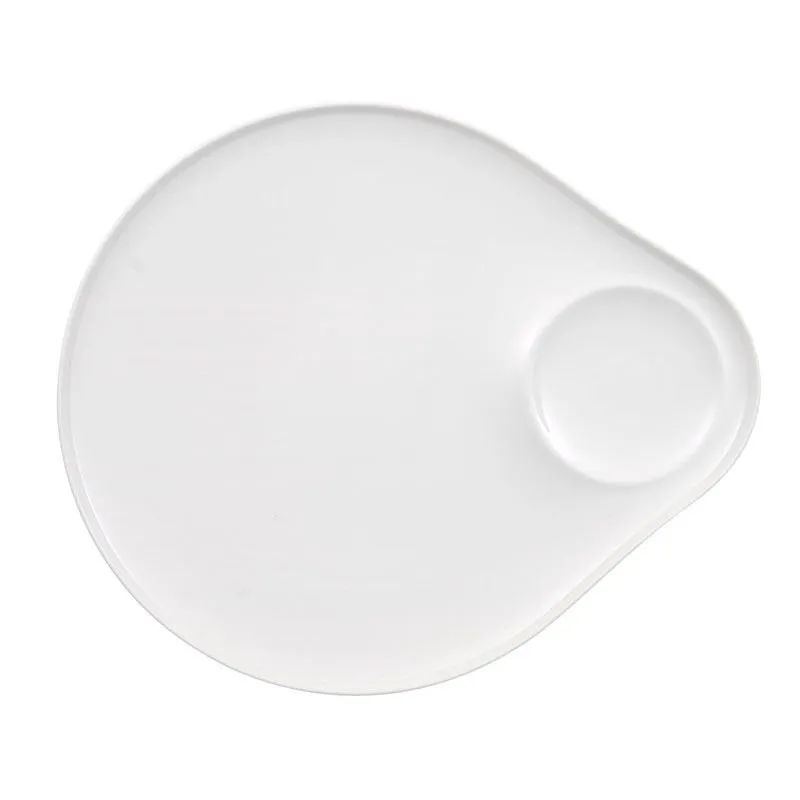 A white ceramic plate with an asymmetrical shape. It features a large, flat surface and a smaller, circular recessed area on one side, suitable for holding a cup or small dish.