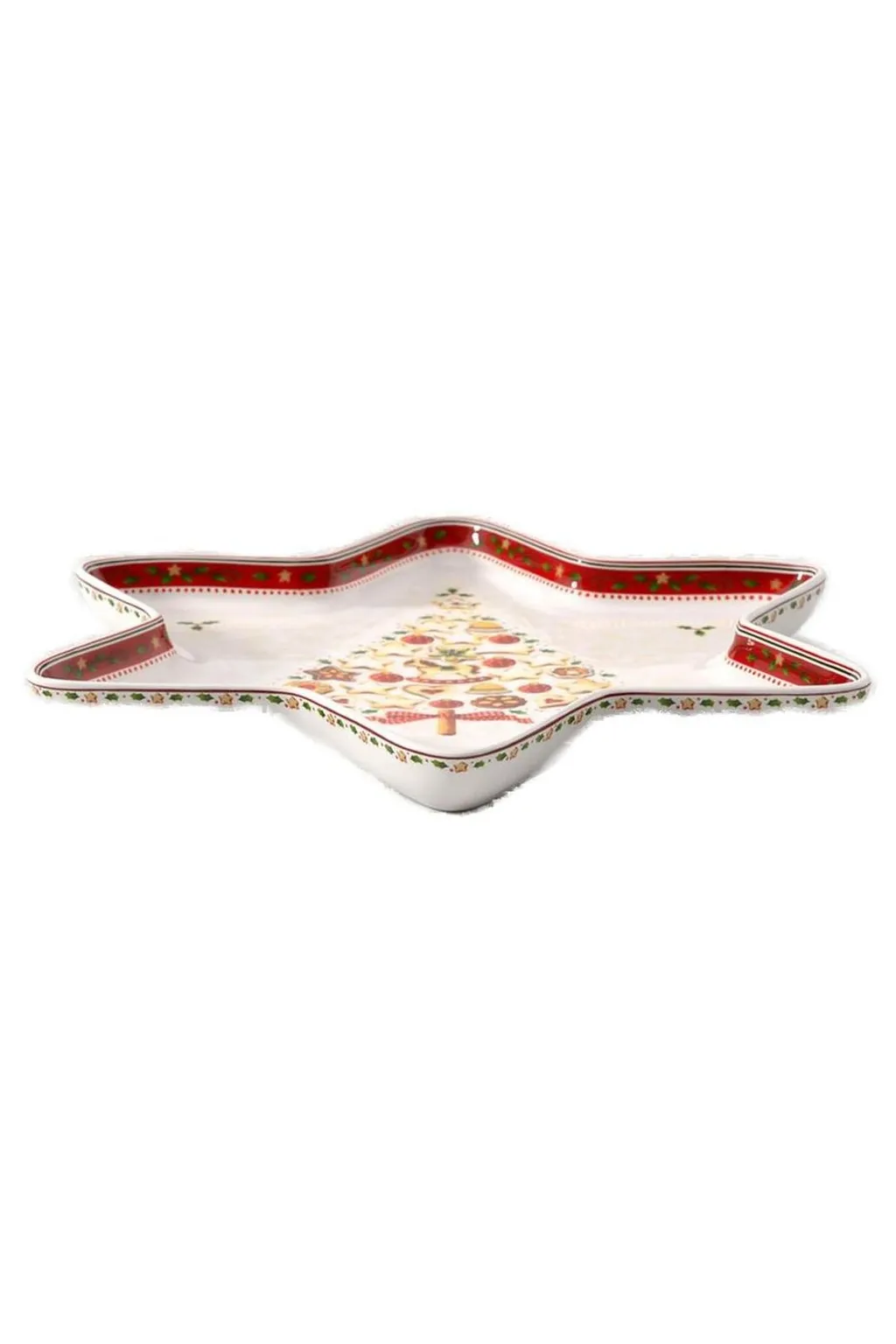 DescriptionA star-shaped serving platter with a festive christmas tree design in the center. The tree is decorated with various christmas-themed cookies and ornaments. The rim of the platter is bordered with a red and white pattern, resembling candy canes or festive ribbon.