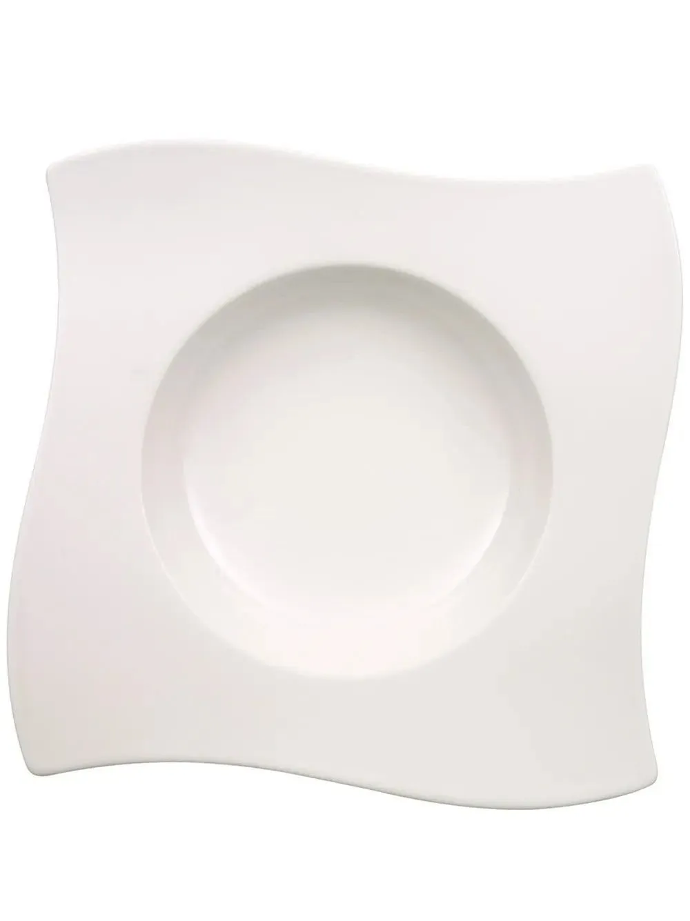 A white ceramic bowl with a wavy square shape. The bowl features a circular indentation in the center, creating a raised rim.