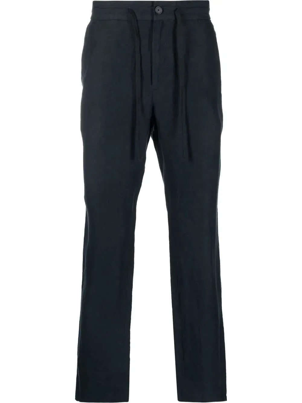 These are black trousers with a drawstring waist and a button closure. They have a straight leg silhouette.