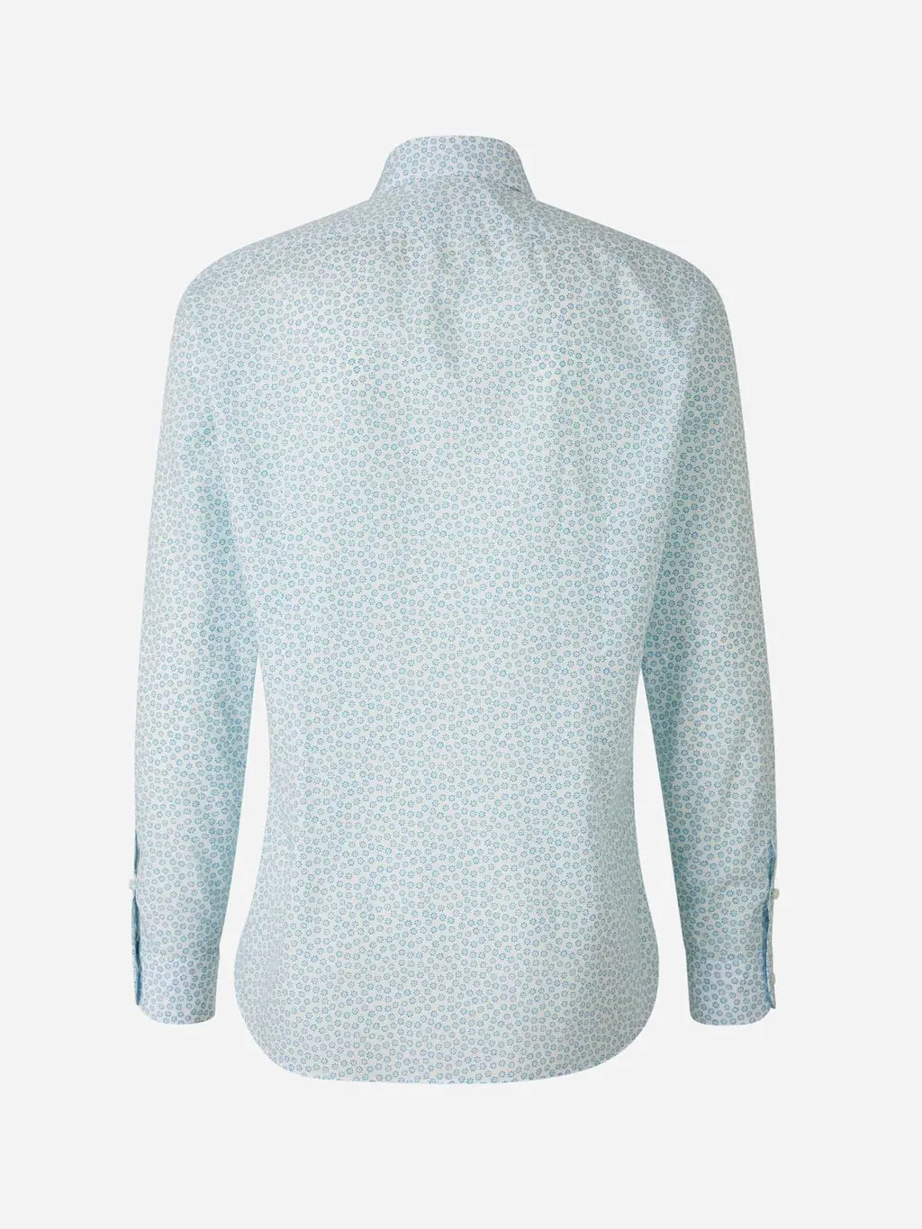 A light blue button-down shirt with a subtle, all-over micro-print in a lighter shade of blue. It features a classic collar, long sleeves with buttoned cuffs, and a button-up front closure. The hemline is curved.