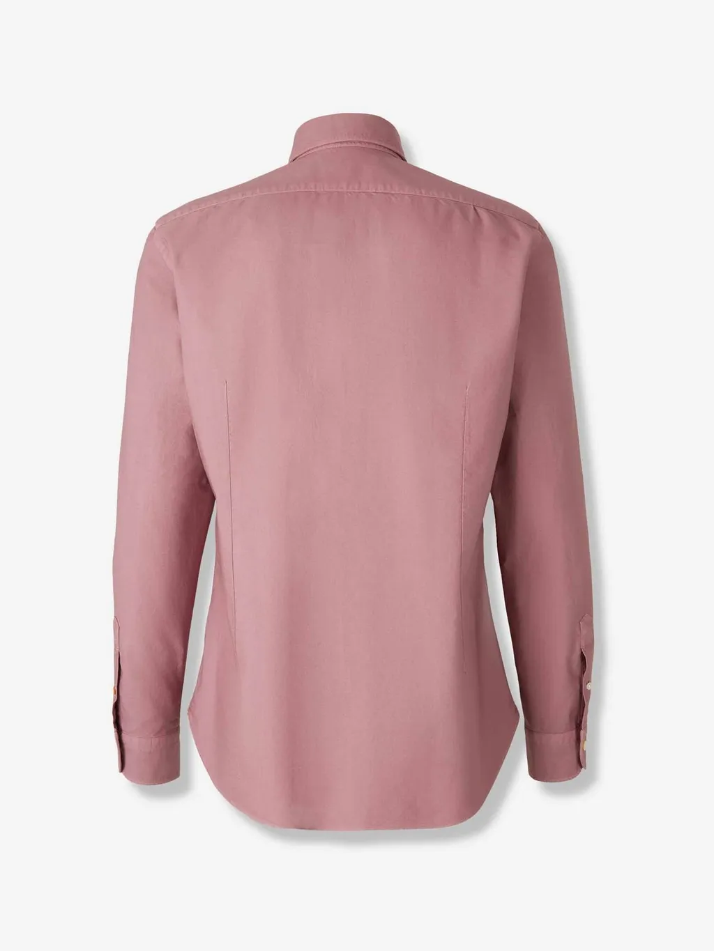 A long-sleeved, collared button-up shirt with a curved hem. The front features a button placket and a pointed collar. The back has subtle darts for shaping.