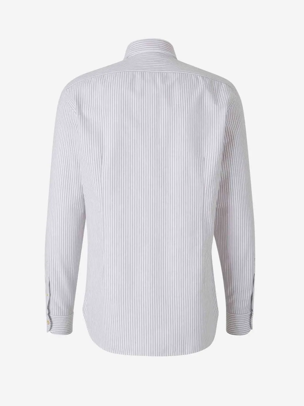 A classic button-down shirt with a subtle vertical stripe pattern. Features a pointed collar, long sleeves with buttoned cuffs, and a button-up front closure.