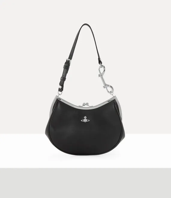 DescriptionOur charm frame purse features a crescent-shaped silhouette, complete with the house's signature silver-tone brass hardware and a secure kiss-lock closure. It includes a removable chain strap, an orb in the centre of the design that symbolises tradition encircled by the celestial rings of saturn, and a zipped interior pocket.