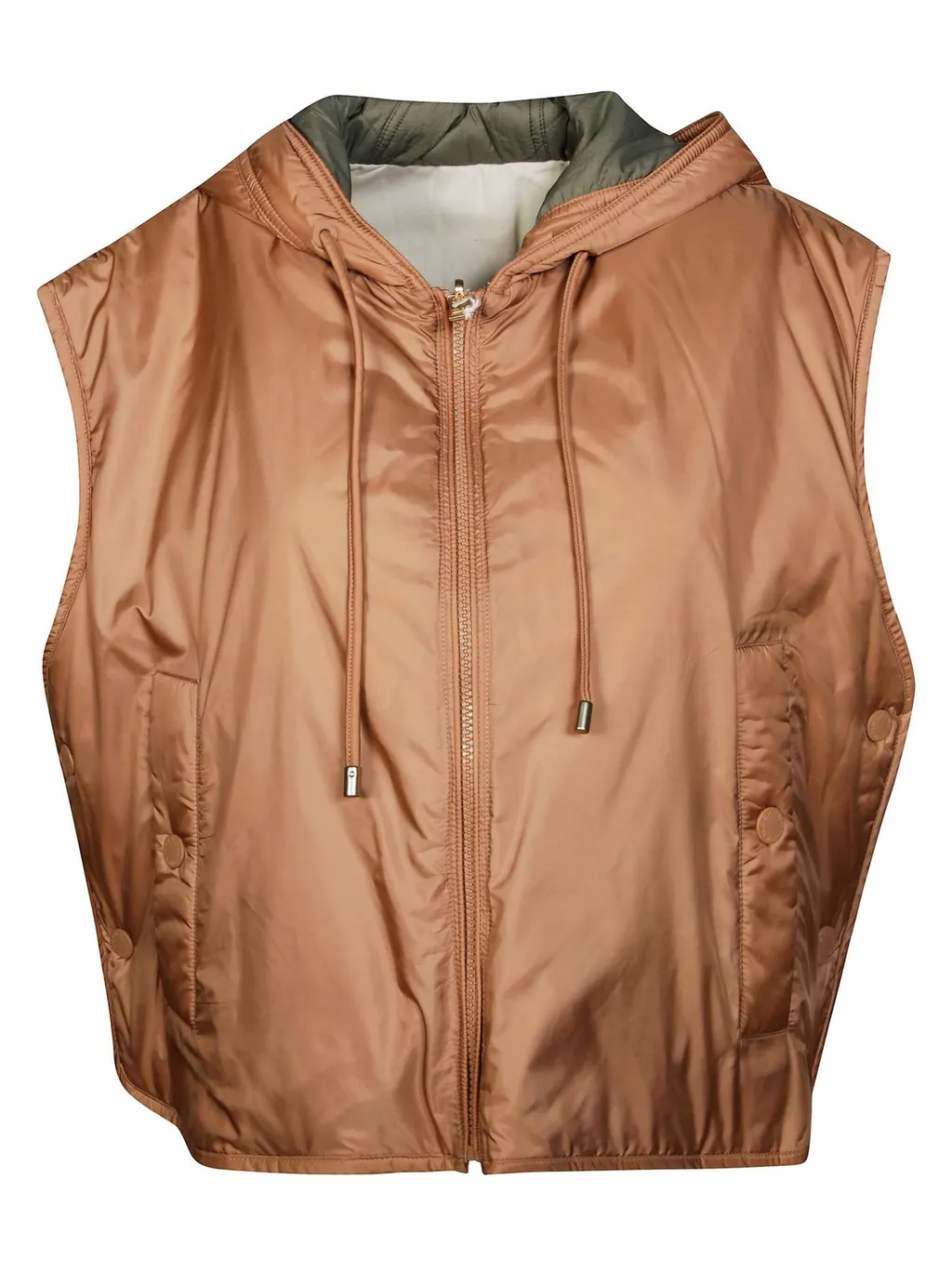 A reversible hooded vest with a front zipper closure and adjustable drawstring hood. Features two side pockets with button closures and a cinched waist detail at the back. One side is a shiny brown, and the other is a muted green.