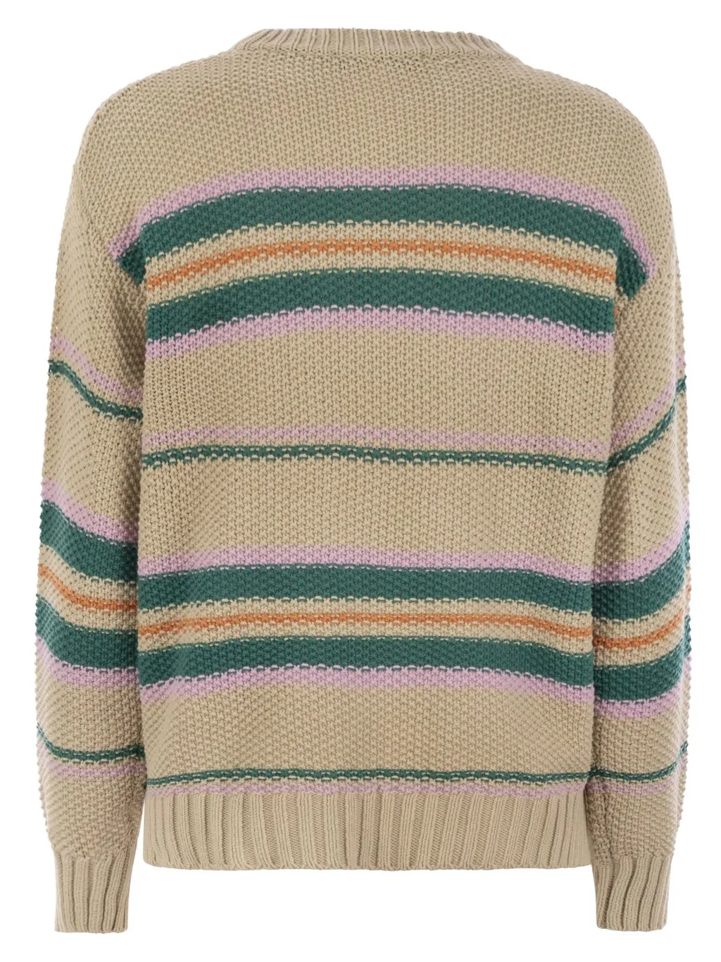 A beige knit sweater with horizontal stripes in green, pink, and orange. The sweater features a crew neck, long sleeves, and ribbed cuffs and hem. Text "weekend" and "amour" is embroidered on the front.