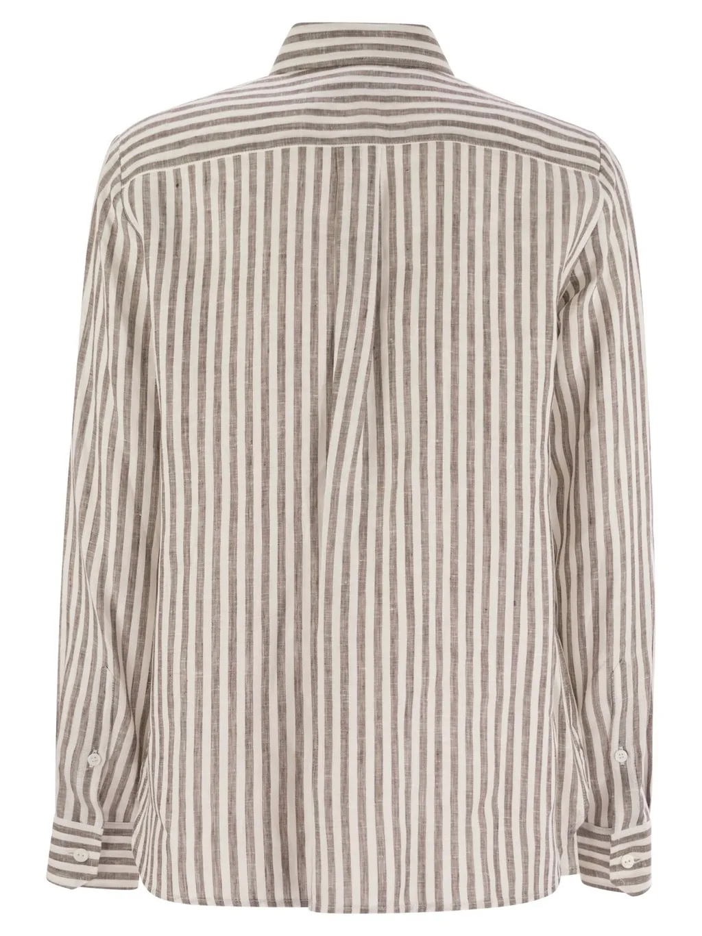 A classic long-sleeved shirt with a pointed collar and button-down front. The shirt features vertical stripes in beige and brown. It has a relaxed fit and a small embroidered logo on the lower right hem.
