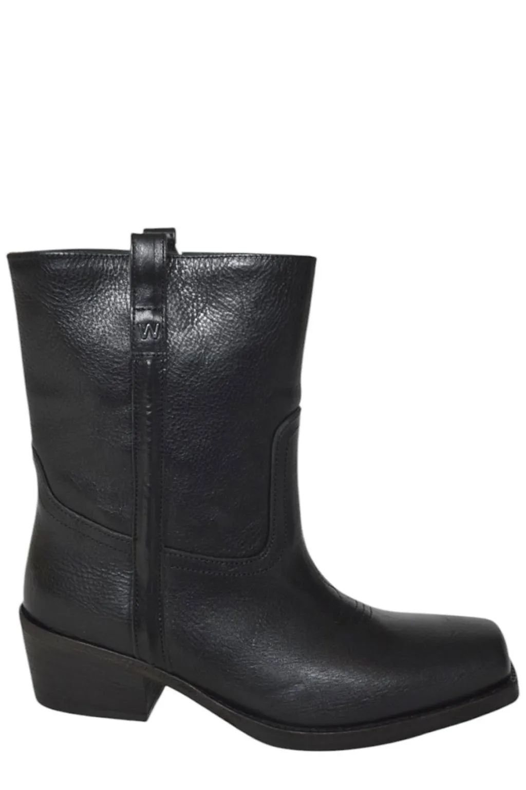 Black leather western boots with a square toe and a stacked heel. The boots have a mid-calf shaft with pull tabs at the top.