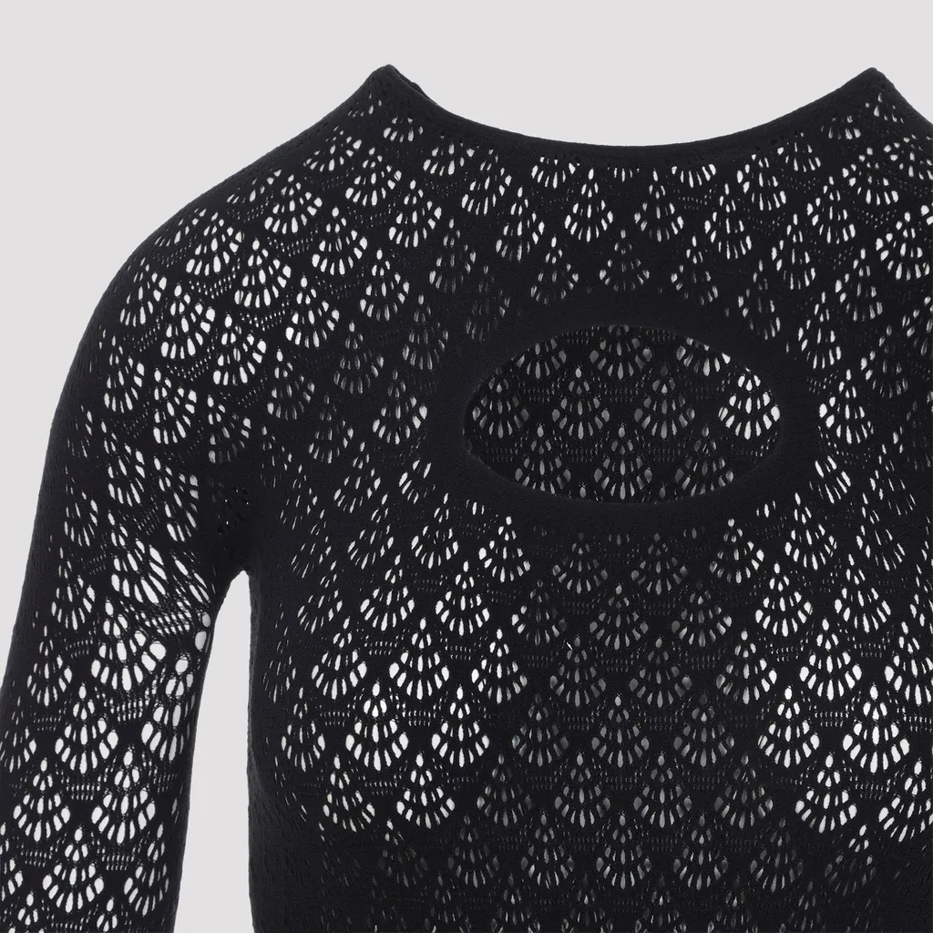 A black, long-sleeved bodysuit with a delicate, diamond-shaped open-knit pattern throughout. It features a crew neckline and a thong bottom.