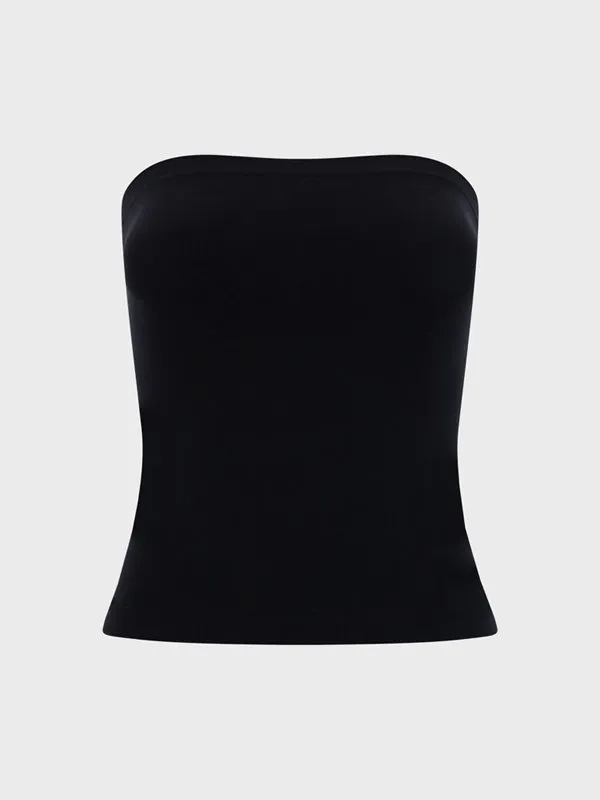 A simple black tube top with a seamless design and a form-fitting silhouette.