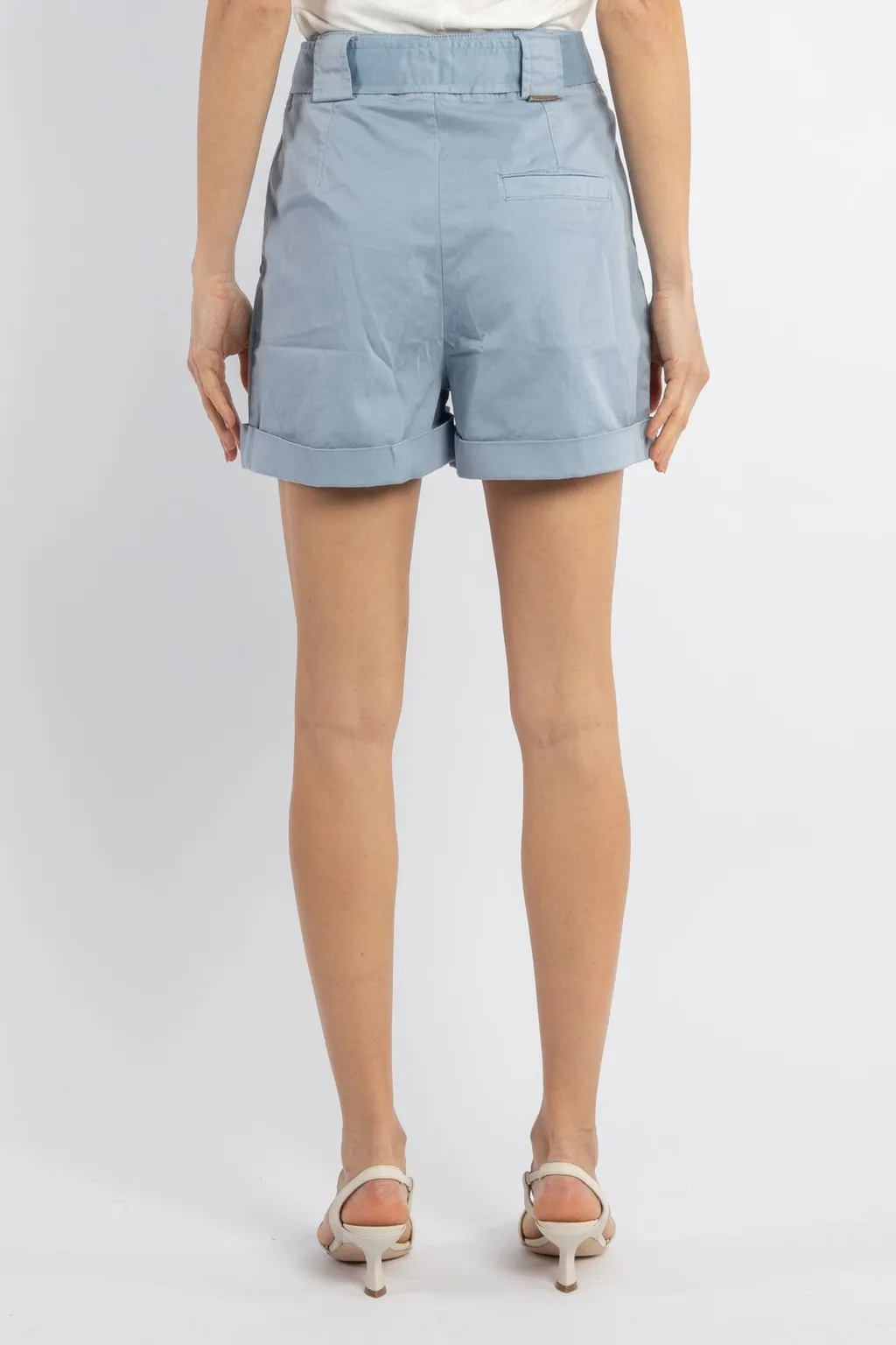 Light blue high-waisted shorts with a self-tie belt at the waist. Features a button-down front closure and cuffed hems. The shorts have a relaxed fit and a paperbag waist.
