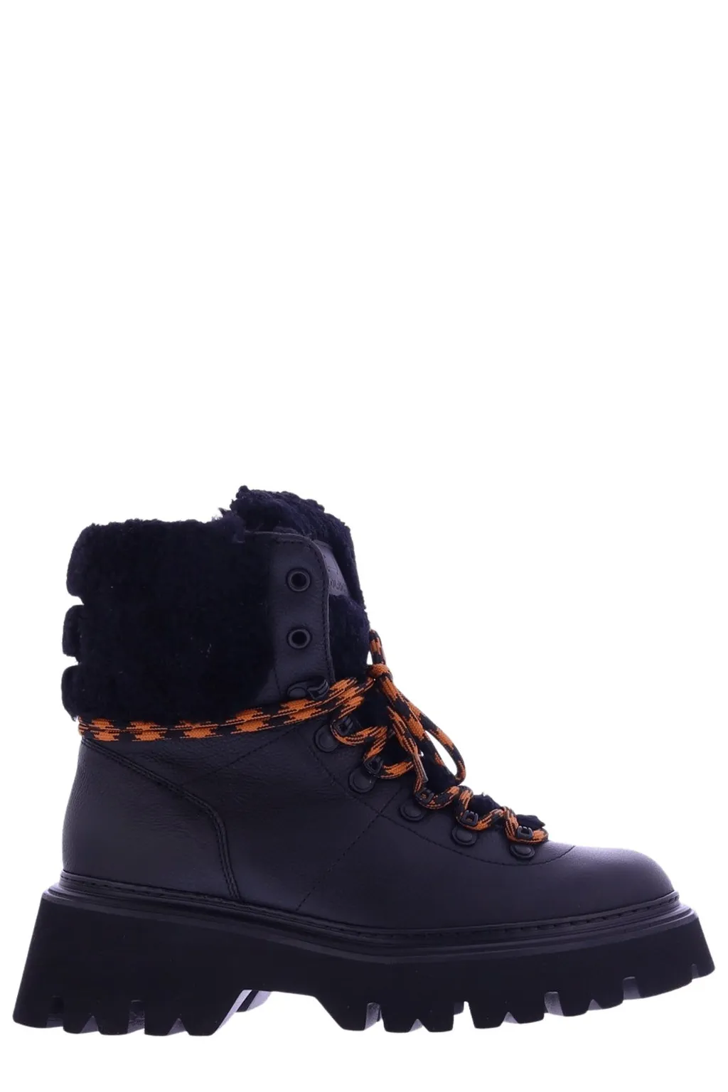 Black leather hiking boots with a chunky lug sole. Features a faux fur trim around the ankle and orange and black laces. The boots have a lace-up closure with metal eyelets.