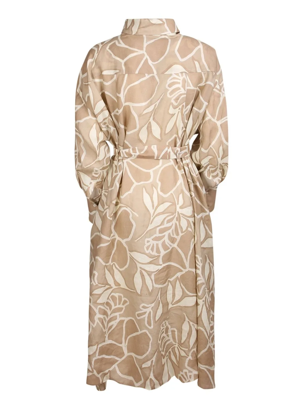 A long-sleeved midi shirt dress with a pointed collar, button-down front, and a matching fabric belt at the waist. The dress features a bold abstract leaf print in beige and white.