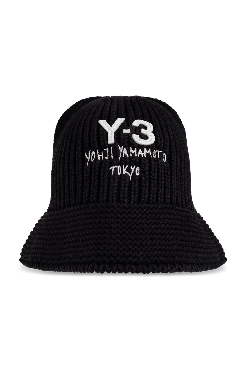 A black knitted bucket hat with a wide brim. The hat features the "y-3" logo in white raised lettering on the front, with "yohji yamamoto" and "tokyo" embroidered below in white.