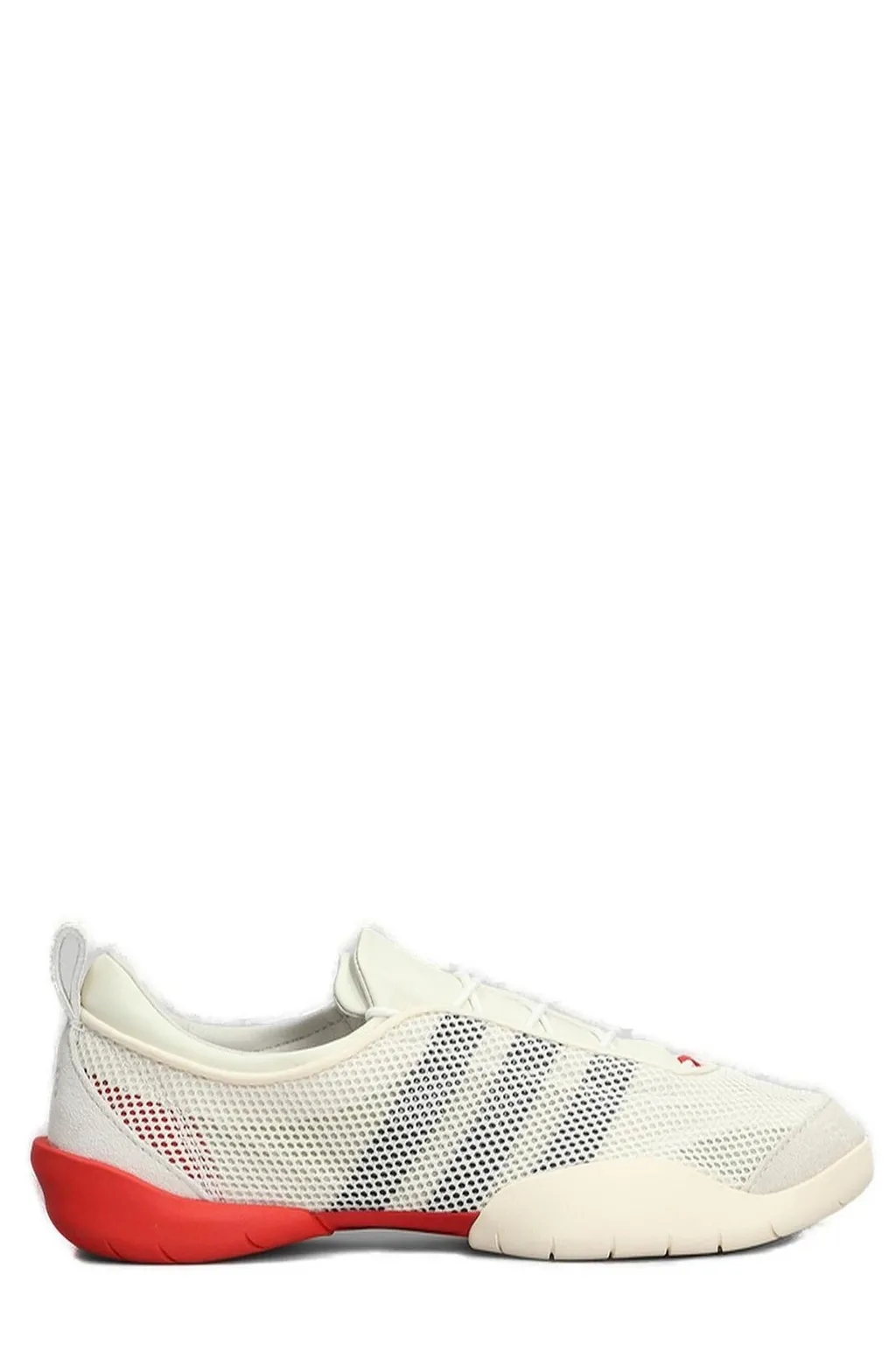 Low-top sneakers with a mesh upper, contrast red heel counter, and a rubber sole.