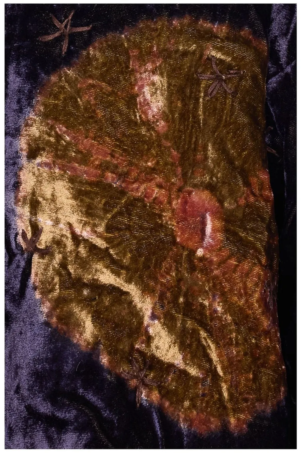 DescriptionA velvet kimono jacket with a unique crinkled texture. It features a bold, abstract pattern of large, circular motifs in gold and rust tones against a deep purple base. Smaller star-like motifs are scattered across the fabric. The jacket has an open front and wide sleeves, characteristic of a kimono silhouette. It is fully lined with a sheer, printed fabric.