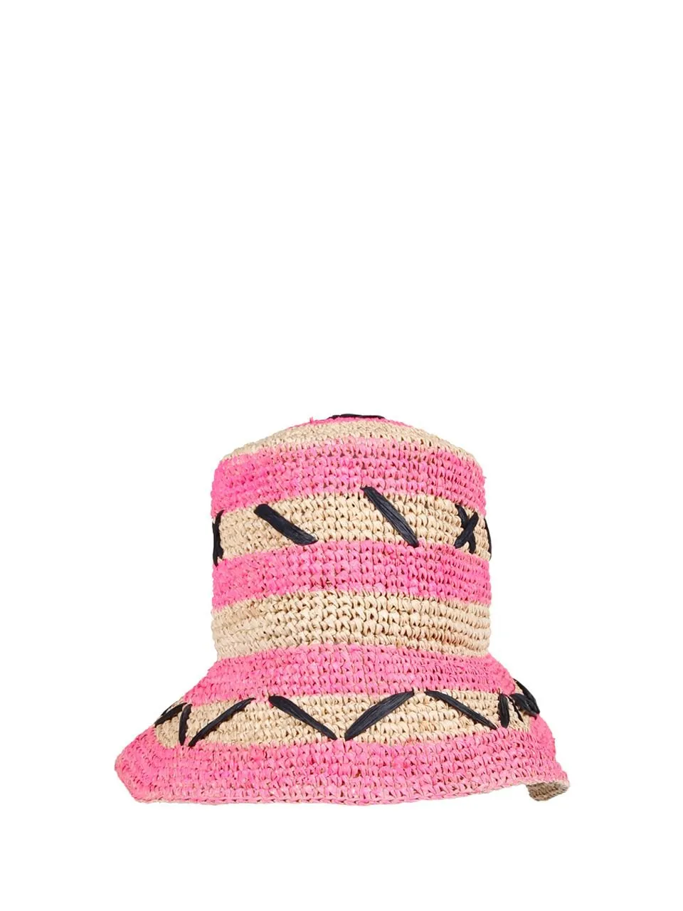 A woven bucket hat with a rounded crown and a wide brim. The hat features horizontal stripes in pink and beige, with black stitching details forming diagonal patterns and crosses. The brim is also edged in pink.