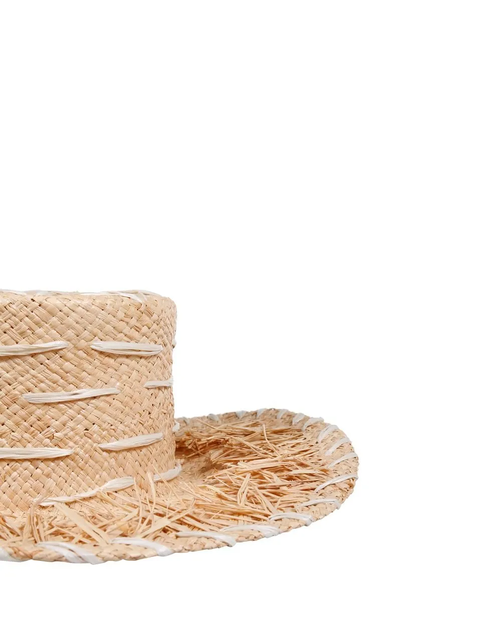 DescriptionA wide-brimmed straw hat with a cylindrical crown. The hat features a frayed edge on the brim and is decorated with horizontal bands of white material around the crown. The straw is woven, and the white bands appear to be a contrasting material.