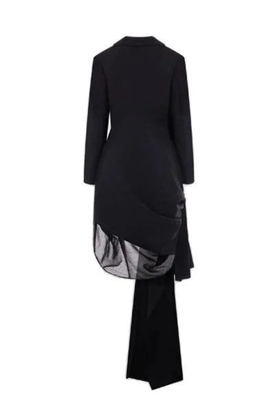 DescriptionA black blazer dress with a deep v-neckline and long sleeves. The dress features an asymmetrical design with dramatic draping and ruching across the front, extending into a long, flowing train. A sheer panel is visible on the lower left side of the dress.