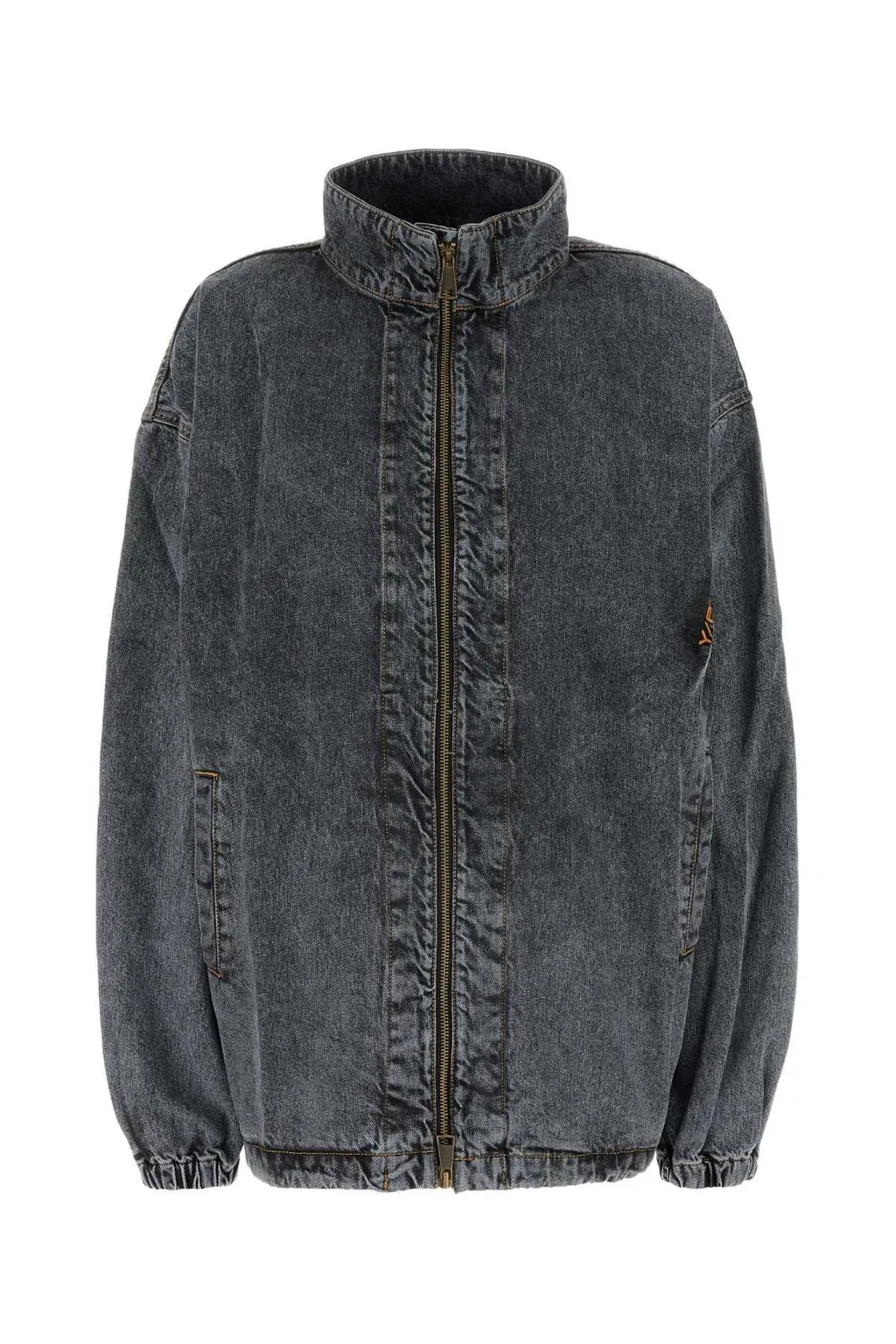 A grey denim jacket with a high collar and a full zip closure. It features a relaxed fit with elasticated cuffs and hem. Two side pockets are visible.