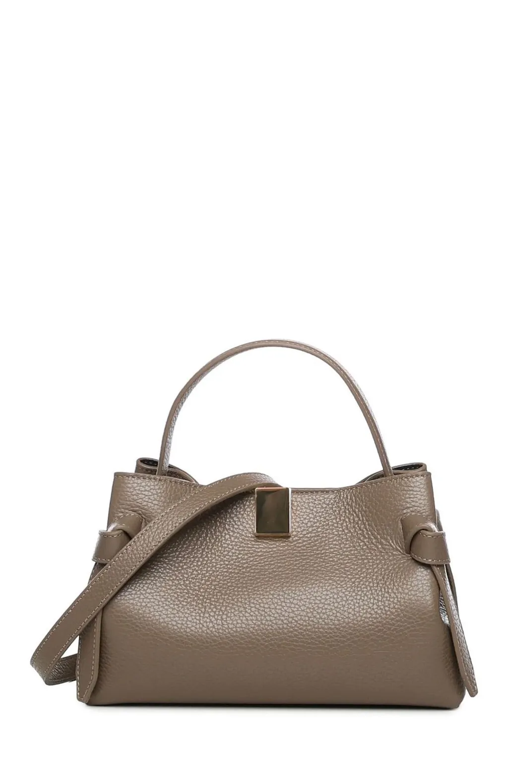 DescriptionA structured top handle bag with a pebbled leather finish. It features a main compartment with a flap closure secured by a gold-tone metal clasp. The bag has two top handles and a detachable crossbody strap. Decorative knots are present on the sides.