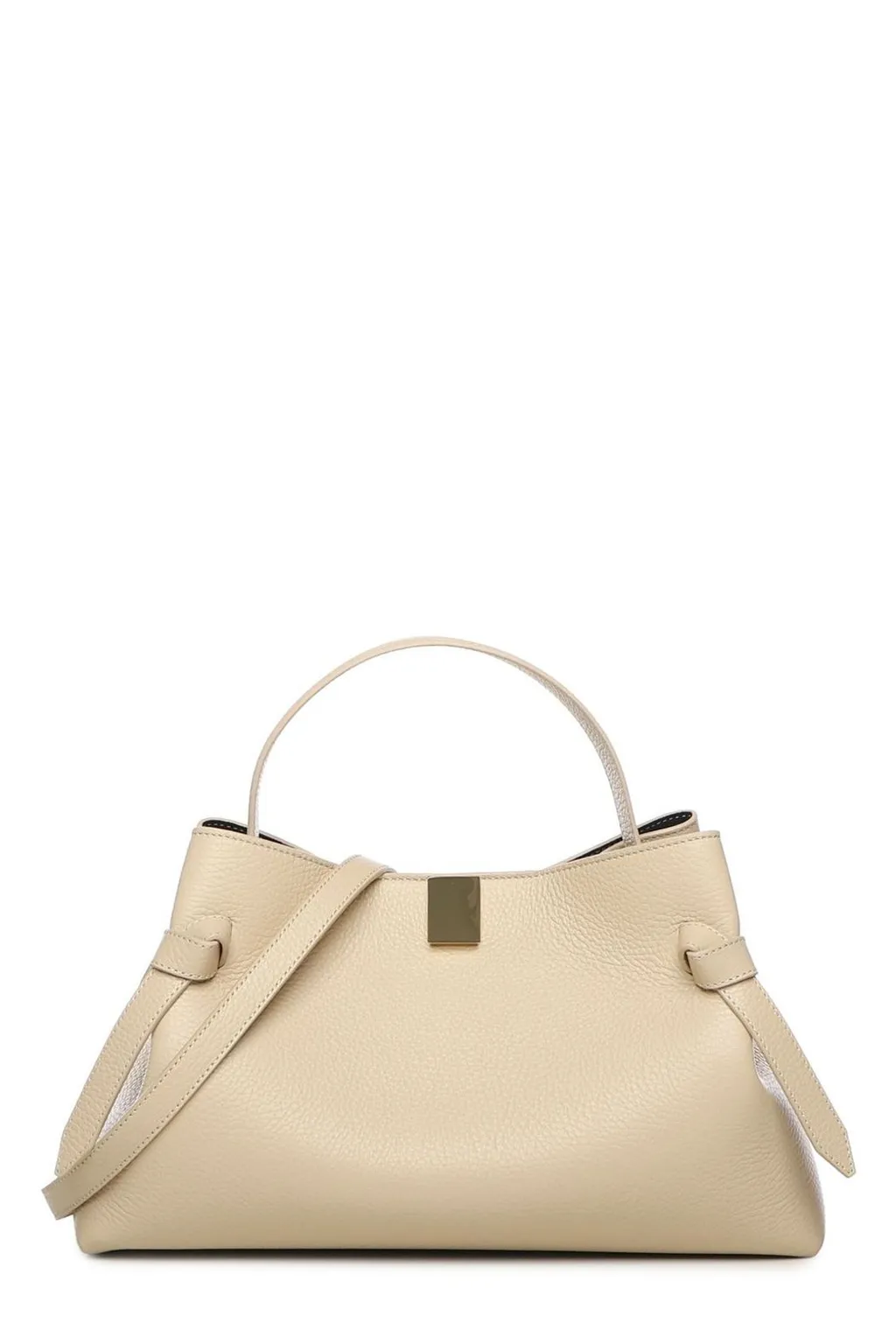 A structured top-handle bag with a central metallic clasp closure. It features two short top handles and a detachable, adjustable shoulder strap. The sides of the bag have adjustable tie details.