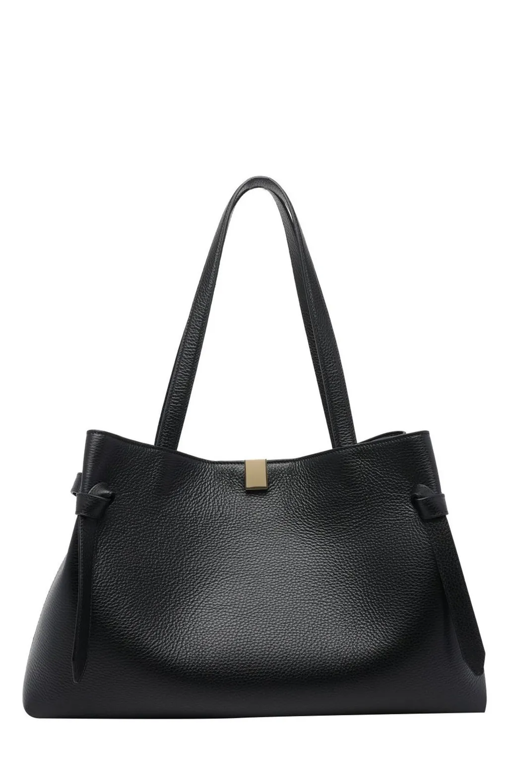 A black leather tote bag with a textured finish. It features two top handles, a gold-tone clasp closure at the top center, and knot details on the sides.