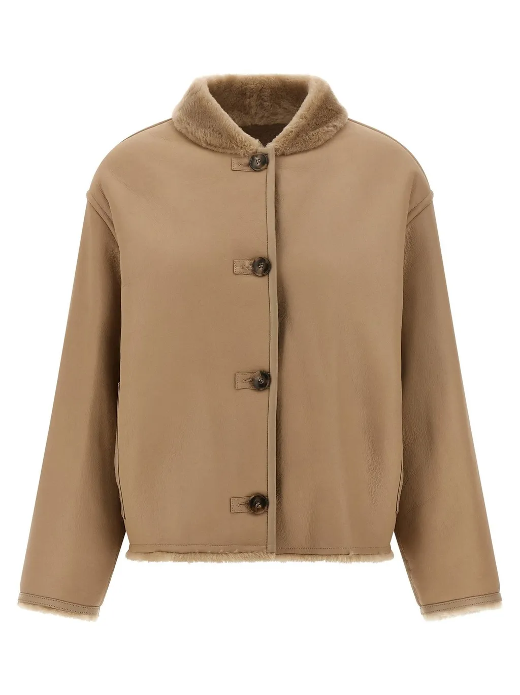 DescriptionA reversible shearling jacket with a turn-down collar and button closure. One side features a smooth leather-like finish with visible shearling trim at the collar, cuffs, and hem. The other side is fully covered in plush shearling. It has a relaxed fit and two side pockets.