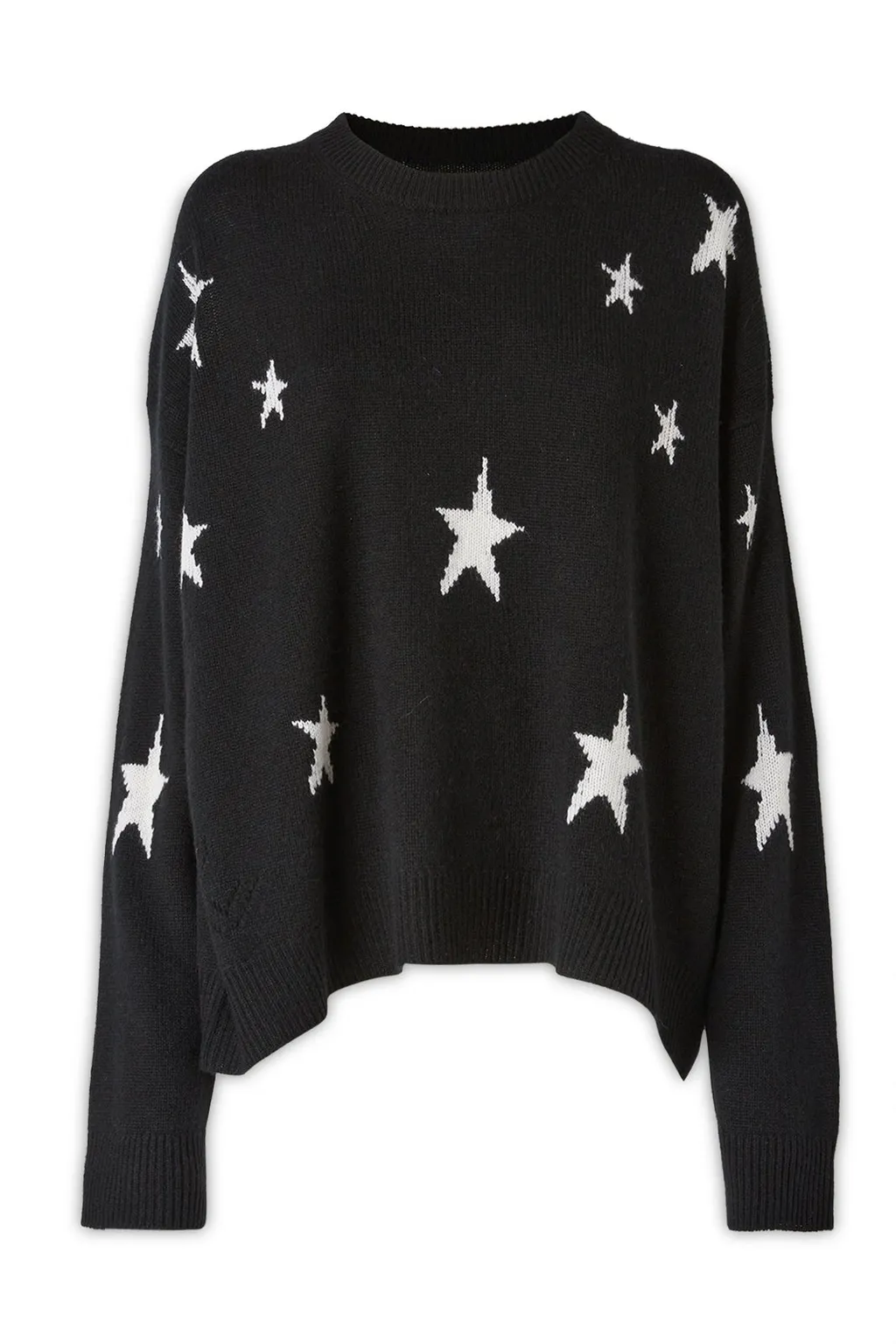A black knitted sweater with a crew neck and long sleeves. It features a scattered white star print all over the front and back. The fit is relaxed and slightly oversized with ribbed cuffs and hem.