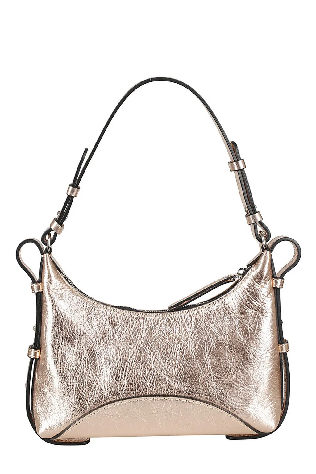 DescriptionA metallic gold hobo bag with a curved silhouette. It features a single shoulder strap with adjustable buckles and a zip closure. The textured finish gives it a unique, crinkled appearance. A contrasting beige panel is present at the bottom.