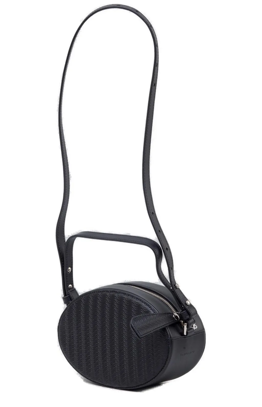 A round crossbody bag with a textured pattern on the front. It features a zipper closure and a long adjustable strap. There is also a top handle for carrying.