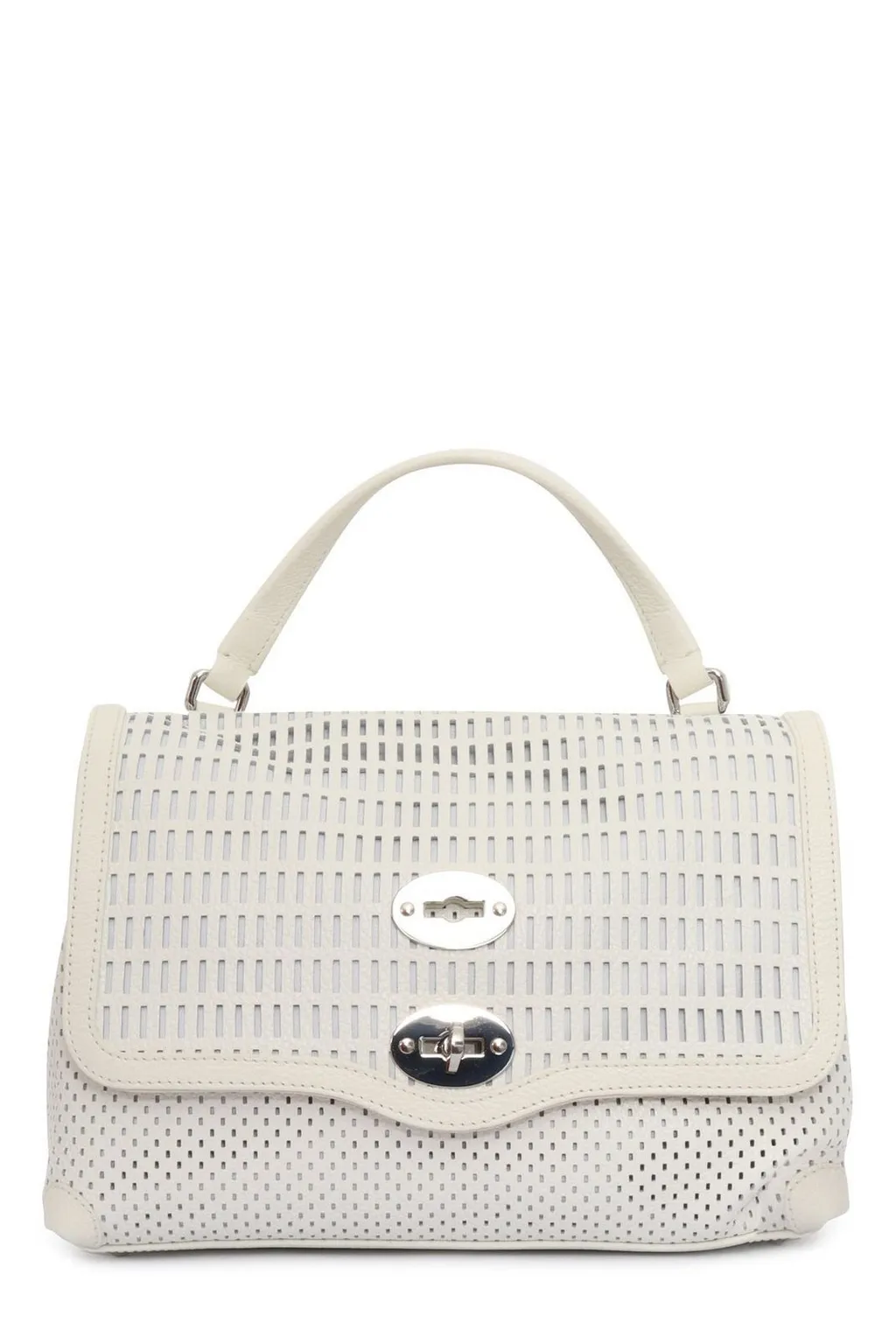 A white perforated leather top handle bag with a flap closure and silver-tone hardware. It features a top handle and a detachable shoulder strap. The bag has a structured silhouette and a decorative turn-lock closure on the front.